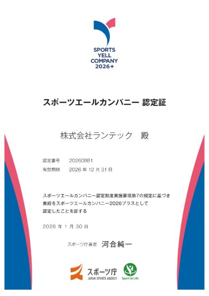 株式会社ランテックは、このたびスポーツ庁より、従業員のスポーツ活動促進に積極的に取り組む企業として「スポーツエールカンパニー2026」に認定され、あわせて「+(プラス)認定」を取得いたしました。スポーツエールカンパニーは、働く世代を中心としたスポーツ実施率の向上を通じて、健康増進やライフパフォーマンスの向上を目指す取り組みとして、スポーツ庁が実施する認定制度です。